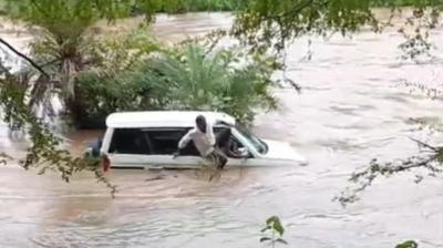 बारिश में उफनाई नदी बनी कहर—मेडिकल ऑफिसर्स की सरकारी गाड़ी बहाव में बही, खजूर में अटकने से बची जान”