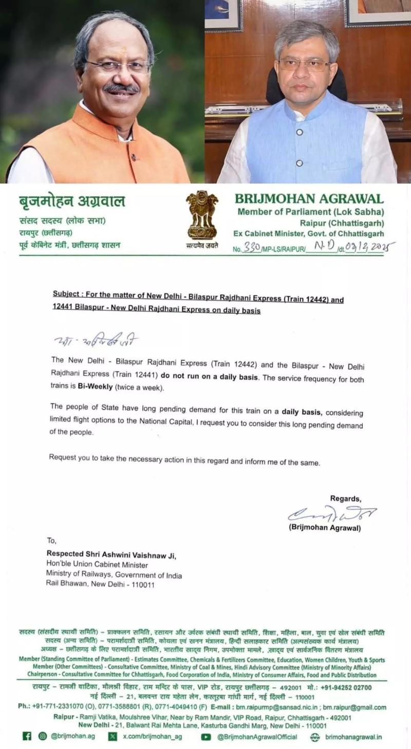 प्रतिनिधिमंडल ने रेल मंत्री से अनुरोध किया कि वर्तमान में सप्ताह में दो बार चलने वाली राजधानी एक्सप्रेस की फ्रीक्वेंसी बढ़ाकर इसे दैनिक किया जाए। प्रतिदिन संचालन से छत्तीसगढ़, मध्य प्रदेश और महाराष्ट्र के यात्रियों को नई दिल्ली तक तेज़, सुगम और विश्वसनीय यात्रा सुविधा मिलेगी। साथ ही समय की बचत होगी और सीट उपलब्धता में भी सुधार आएगा।