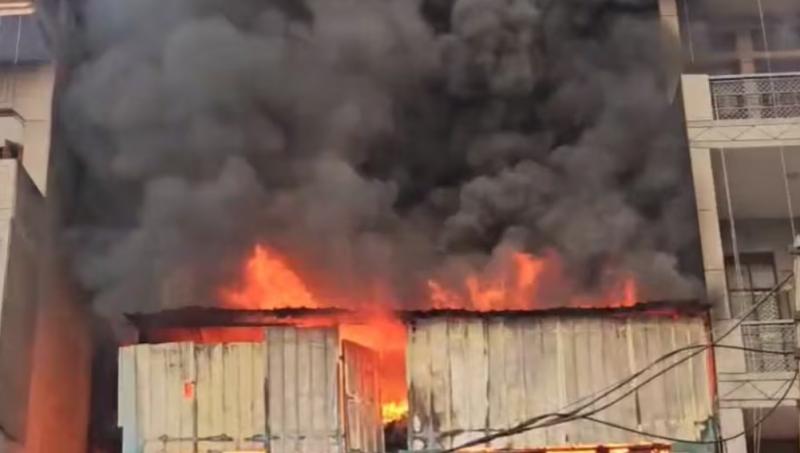 नरेला में जूते की फैक्टरी में भीषण आग, आसमान में छाया काला धुआं