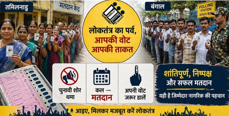 नई दिल्ली: कल गुरुवार, 23 अप्रैल 2026 को होने जा रहे लोकतंत्र के महापर्व के लिए चुनावी बिसात बिछ चुकी है। मंगलवार शाम 5 बजे के साथ ही तमिलनाडु की सभी सीटों और पश्चिम बंगाल के पहले चरण के लिए शोर-शराबा थम गया है। अब उम्मीदवारों की किस्मत का फैसला मतदाताओं के हाथ में है।